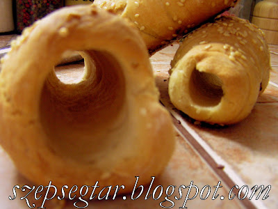 A vízben elkeverem az élesztőt, a cukrot és a sót. Megy bele a liszt. Tulajdonképpen fakanállal is összekeverhető, gyúrást csak a végén igényel, kb öt mozdulat és összeáll a tészta. A "meggyúrt" tésztát lefedem és hagyom pihenni kb fél órát. Átgyúrom és újra magára hagyom egy fél órára. A formákat bekentem olajjal, a tésztából darabokat téptem (hat felé szedtem) és hosszú csíkokat sodortam belőlük. Feltekertem a rolóformára, majd meghempergettem őket, hogy a tészta mindenhol egyforma vastag legyen. A sütőedénybe szezámmagot szórtam és átforgattam rajtuk a tésztákat. 190 fokos sütőben (gázsütő 4-5 közötti hőfokon) kb 40 percet sütöttem. Amikor megpirult, meglocsoltam vízzel.